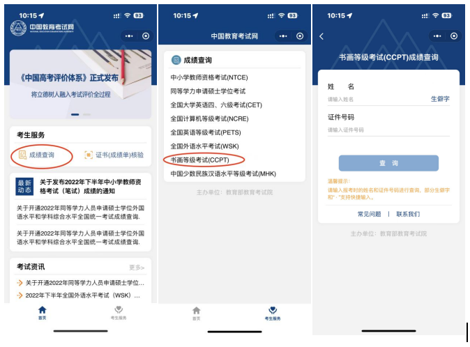 手机微信小程序中搜索 “中国教育考试网”进入→点击成绩查询→点击书画等级考试(ccpt)→输入考生姓名、证件号码→点击查询